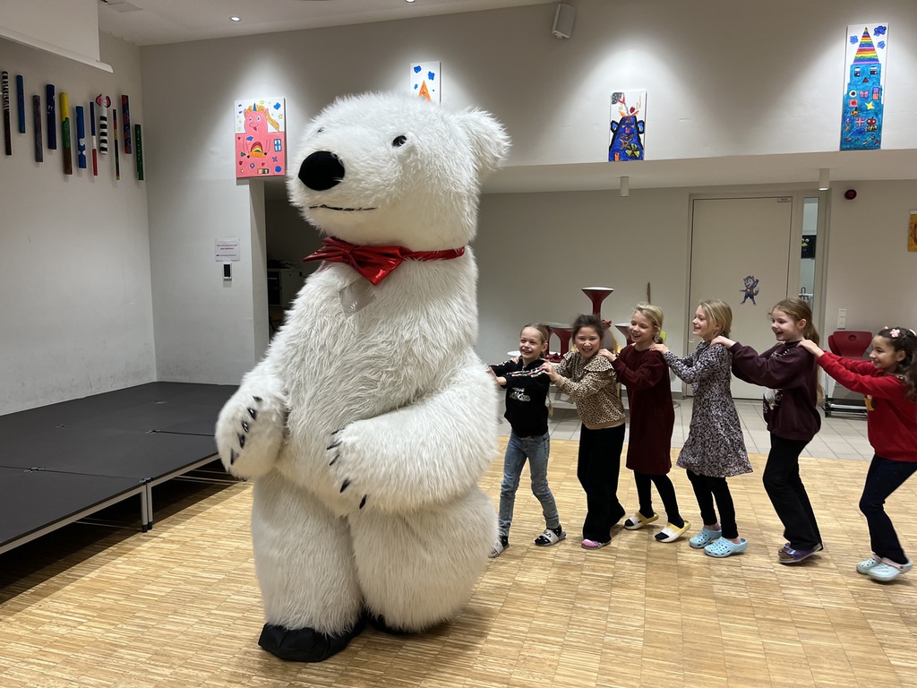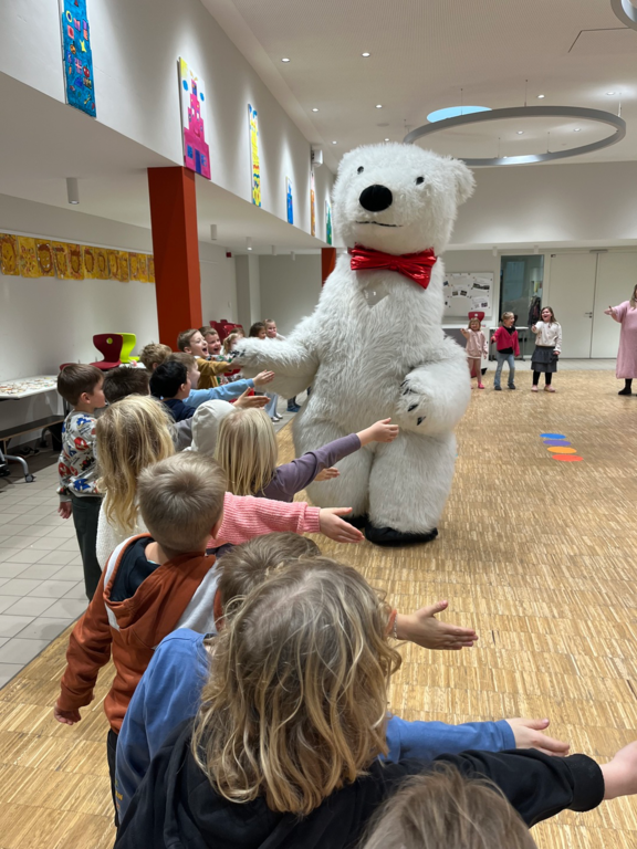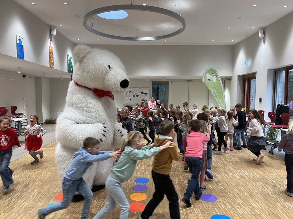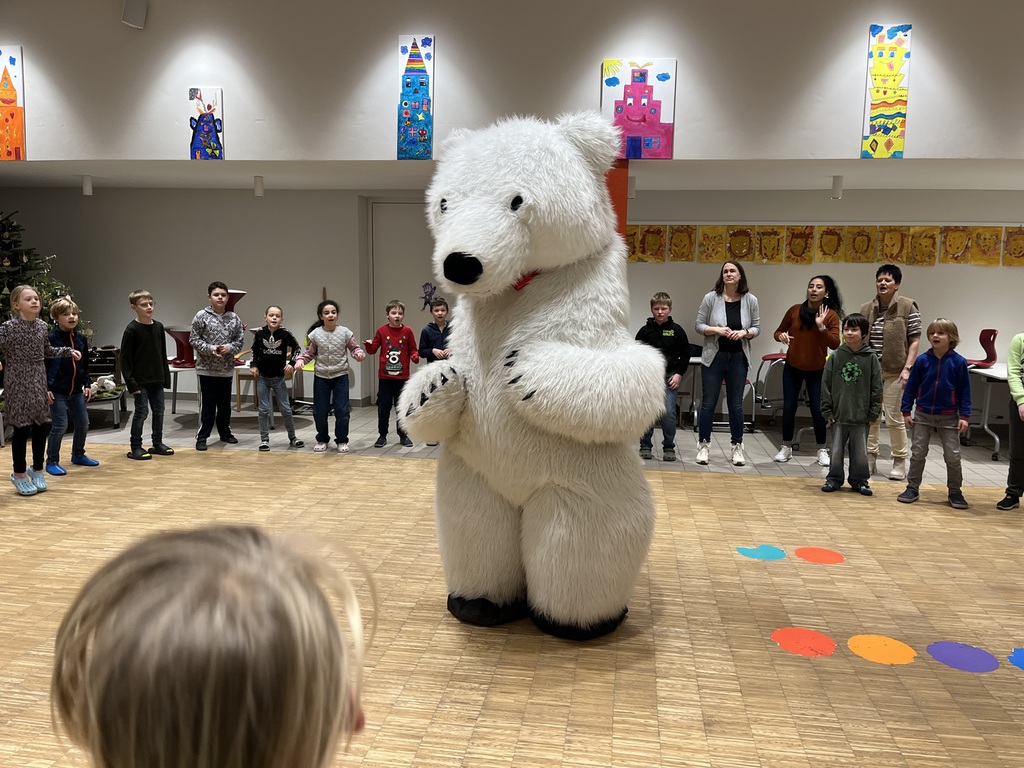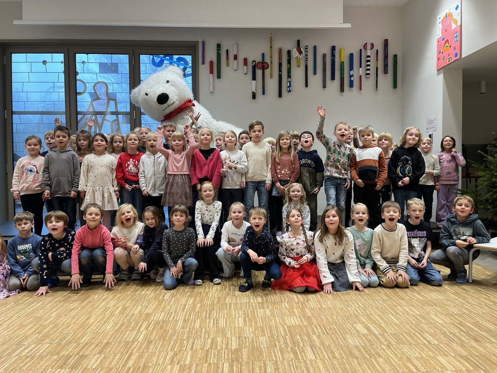 Der Abschied fiel jedoch alles andere als still aus: Ekaterina verabschiedete sich von den Erst- und Drittklässlern auf besonders erlebnisreiche Weise. Als Weihnachtsbär verkleidet feierte sie gemeinsam mit der 1. und der 3. Klasse eine fröhliche Party in der Aula. Musik, Bewegung und viel gemeinsames Lachen sorgten für große Freude bei allen Kindern.