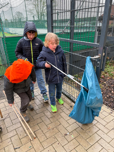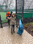 Ausgerüstet mit Schutzhandschuhen, (Müll-) Greifern und Müllsäcken machten sich die Jungs und Mädchen aus den 2. Klassen mit ihm daran, ihre Schulumgebung zu säubern.