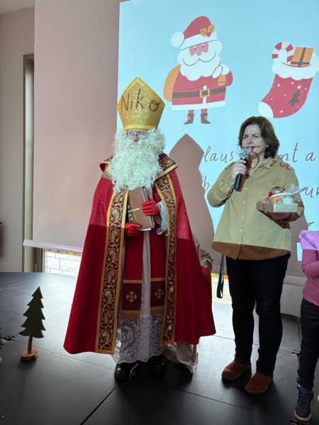 Frau Kemper begrüßte den Nikolaus, bevor die Kinder aus der Klasse 1a und 1b einen Weihnachts - Mambo -Tanz vorführten.