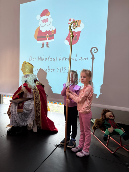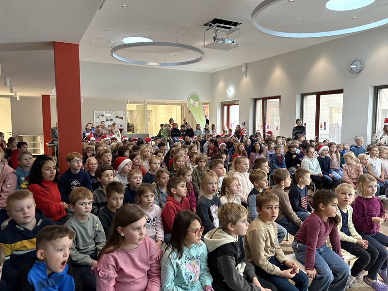 Der Nikolaus besuchte die Kinder, die in der schön geschmückten Aula auf ihn warteten. Sie begleiteten den heiligen Mann mit dem gemeinsamen Lied "Sei gegrüßt, lieber Nikolaus" bei seinem Einzug in die Aula.